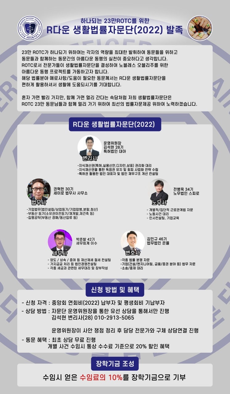 23만 ROTC가 하나되기 위하여는 각자의 역량을 최대한 발휘하여 동문들을 위하고 동문들과 함께하는 동문간의 아름다운 동행의 실천이 중요하다고 생각합니다. ROTC로서 전문가들이 생활법률자문단을 결성하여 노블레스 오블리주를 위한 아름다운 동행 프로젝트를 가동하고자 합니다.